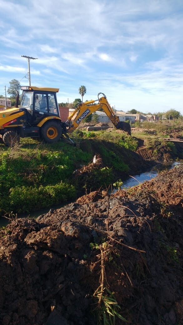 A Administração Municipal através da Secretaria de Obras está realizando a limpeza da sanga da Delíbio da Fontoura no Bairro Jardim Paraíso. A limpeza está sendo feita com uma retro escavadeira e todo o material retirado será transportado pelos caminhões. A ação se faz necessária pelo período chuvoso o que acarreta em grande volume de água e estando o valo cheio de detritos acaba por transbordar. O que chama atenção é quantidade de entulho (lixo) que saiu do interior da sanga.