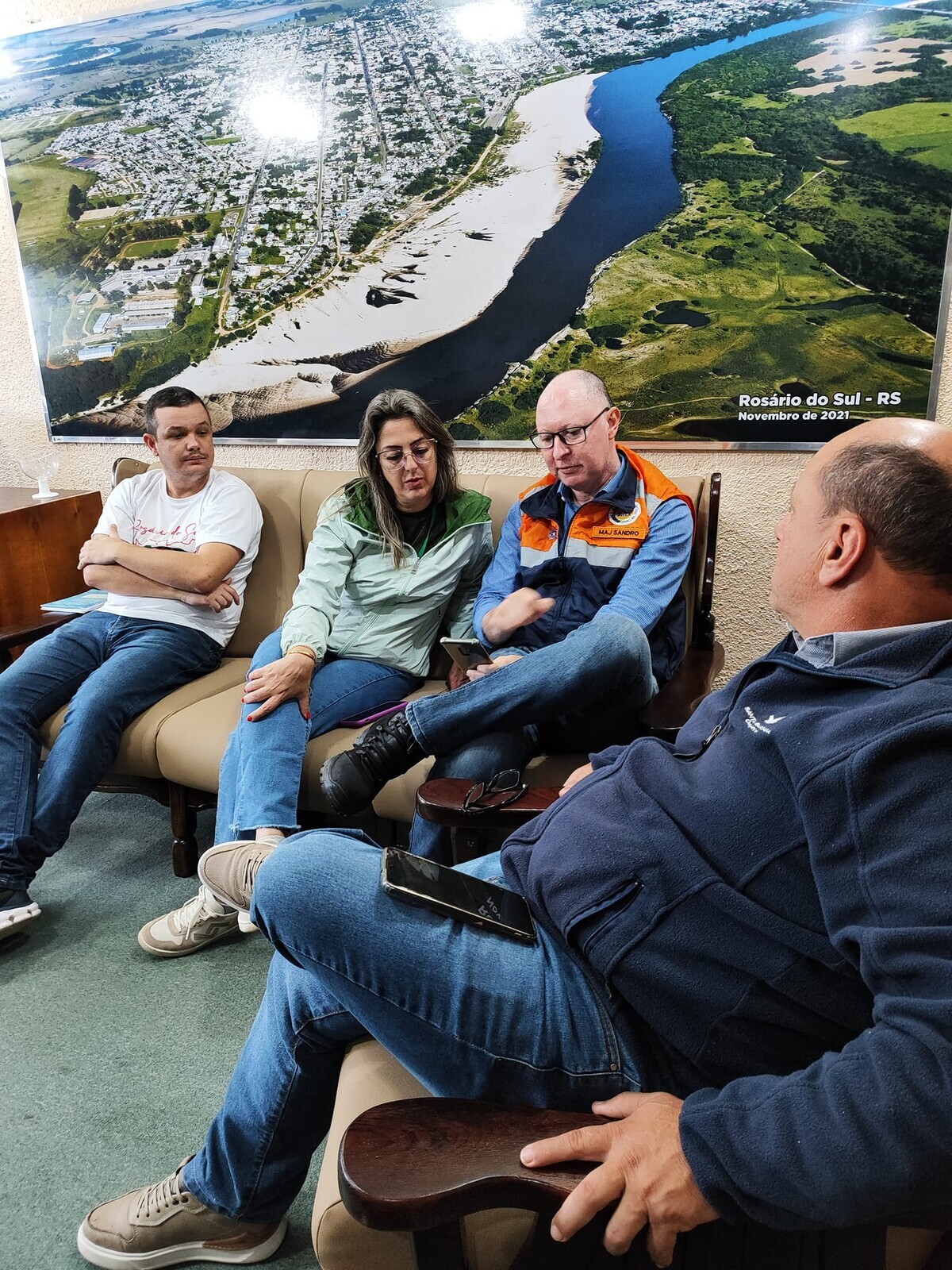O Prefeito Municipal Vilmar Oliveira e o Vice-Prefeito Eduardo Ustra Ribeiro, acompanhados da Secretaria Municipal do Trabalho, Habitação e Assistência Social e a Defesa Civil Municipal, receberam no gabinete do executivo os coordenadores da Defesa Civil da fronteira oeste do Estado, Major Luiz Sandro e Tenente Mário Brittos.