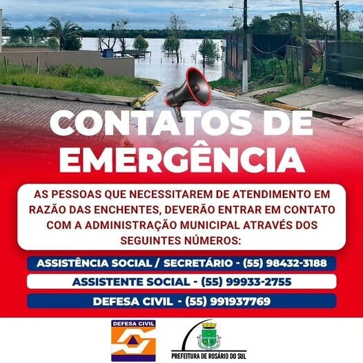 A Prefeitura Municipal de Rosário do Sul, através do Prefeito Vilmar Oliveira, informa os contatos de emergência disponíveis para os atendimentos em decorrência das chuvas.