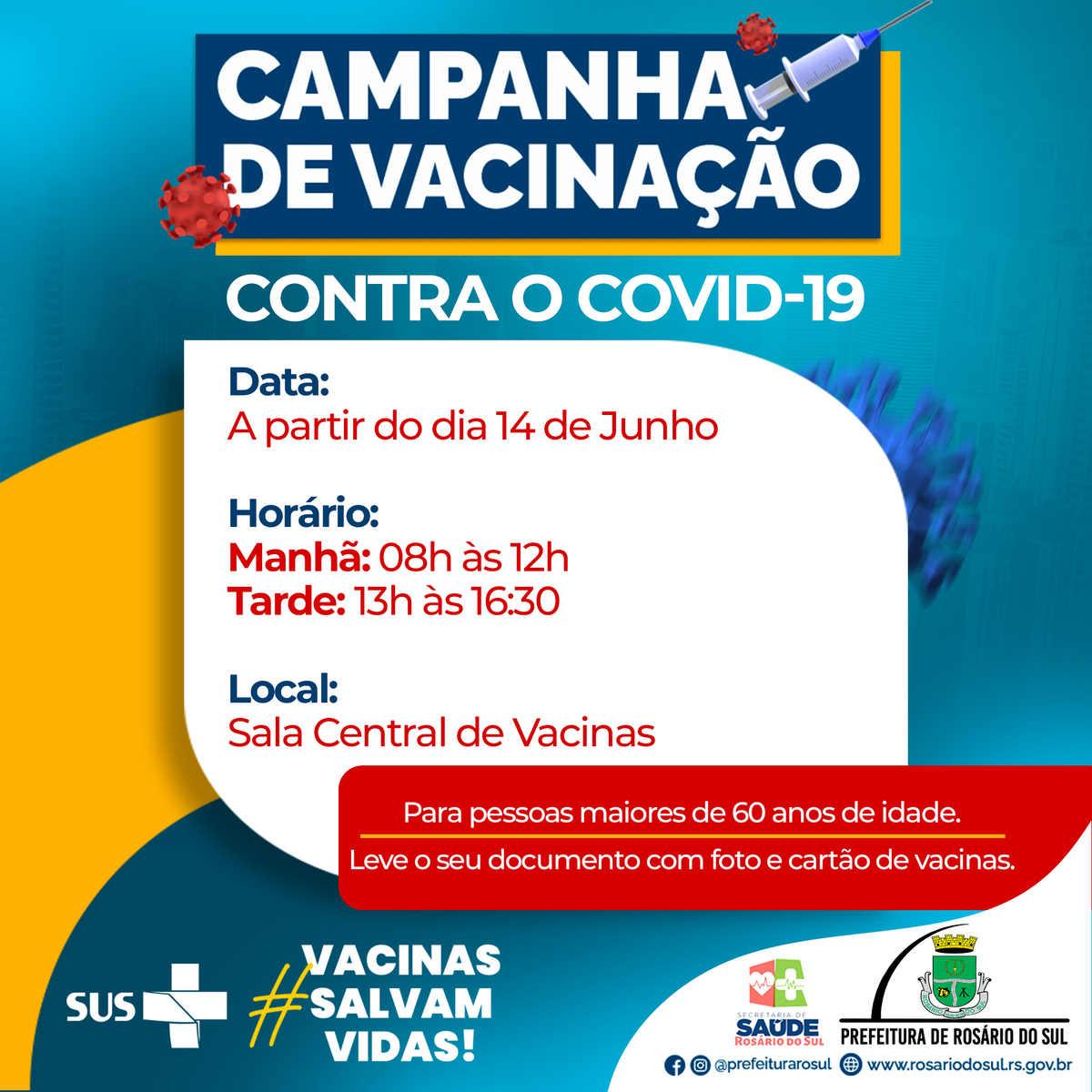 Nesta sexta-feira, dia 14, a Sala Central de Vacina estará recebendo pessoas com 60 anos ou mais que queiram realizar o imunização.