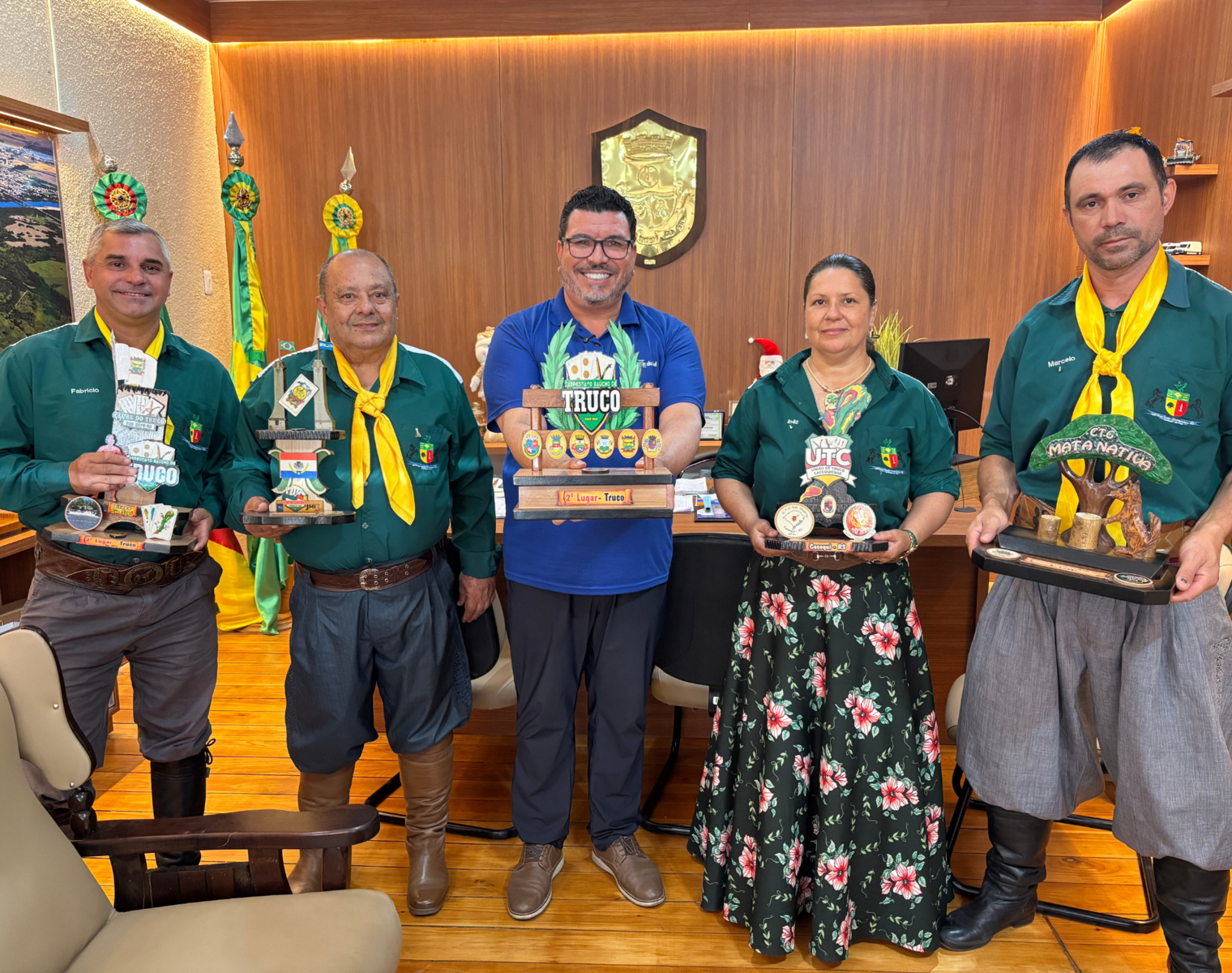 O prefeito Marcos PauloSilva da Luz, recebeu no gabinete, nesta quarta-feira (3), integrantes do Departamento de Truco do CTG Adaga Velha, que conquistaram o 2º lugar geral no Campeonato Gaúcho de Truco.