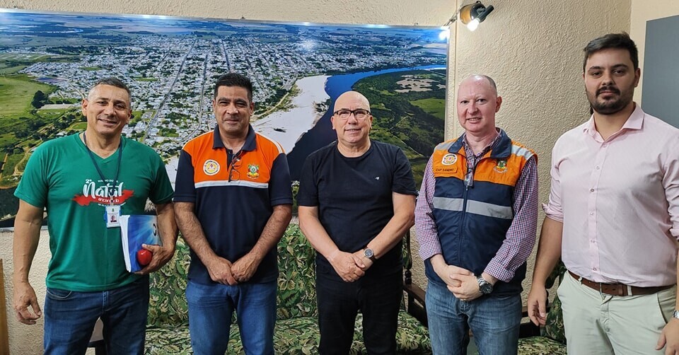 Na manhã desta sexta-feira (24), o Prefeito Municipal, Vilmar Oliveira, acompanhado do Procurador Geral do Município, Matheus Baptistella e do Coordenador Municipal da Defesa Civil, Leandro dos Santos e Silva, recebeu no seu gabinete o Capitão Sandro, Coordenador Regional, e o Mário Britos, Adjunto, da Defesa Civil.